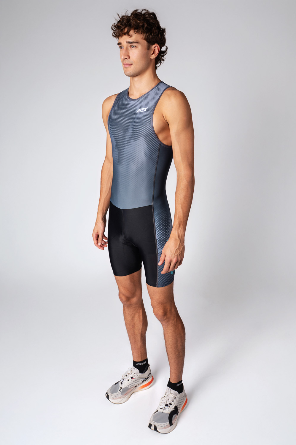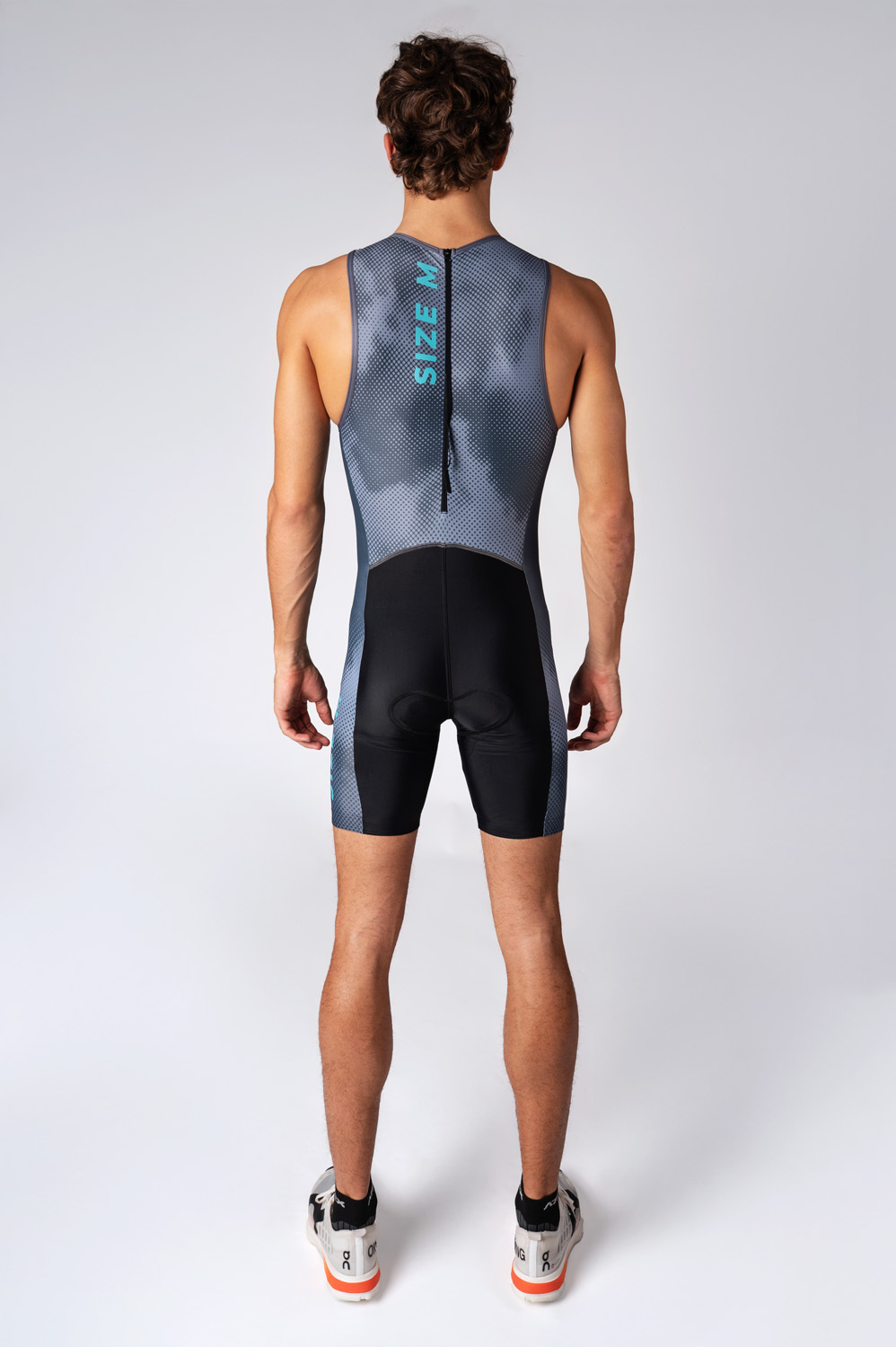 Triatlonová kombinéza bez rukávů má krátké nohavice zakončené protiskluzovou gumou, která pomáhá udržet oděv stabilně na místě při pohybu. Na předním díle je podložený zip s překrytem, který chrání před nepříjemným kontaktem se zipem při delším nošení. Kombinéza je vybavena vystýlkou TRIATLON od renomované italské značky Elastic Interface, která je přizpůsobena specifickým potřebám vícedisciplinových závodů.