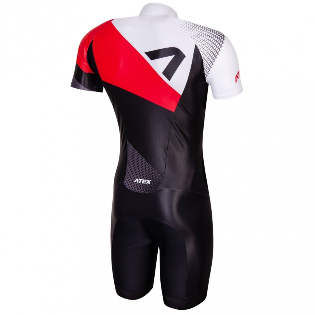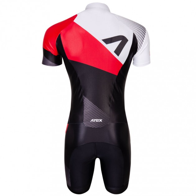 Kombinéza má na předním díle zip s vrchní krytkou, stoják u krku je v zádní části vyvýšený, krátké raglánové rukávy jsou v přední části specificky tvarované, nohavice s délkou do půli stehen zakončené 4 cm širokou protiskluzovou gumou.